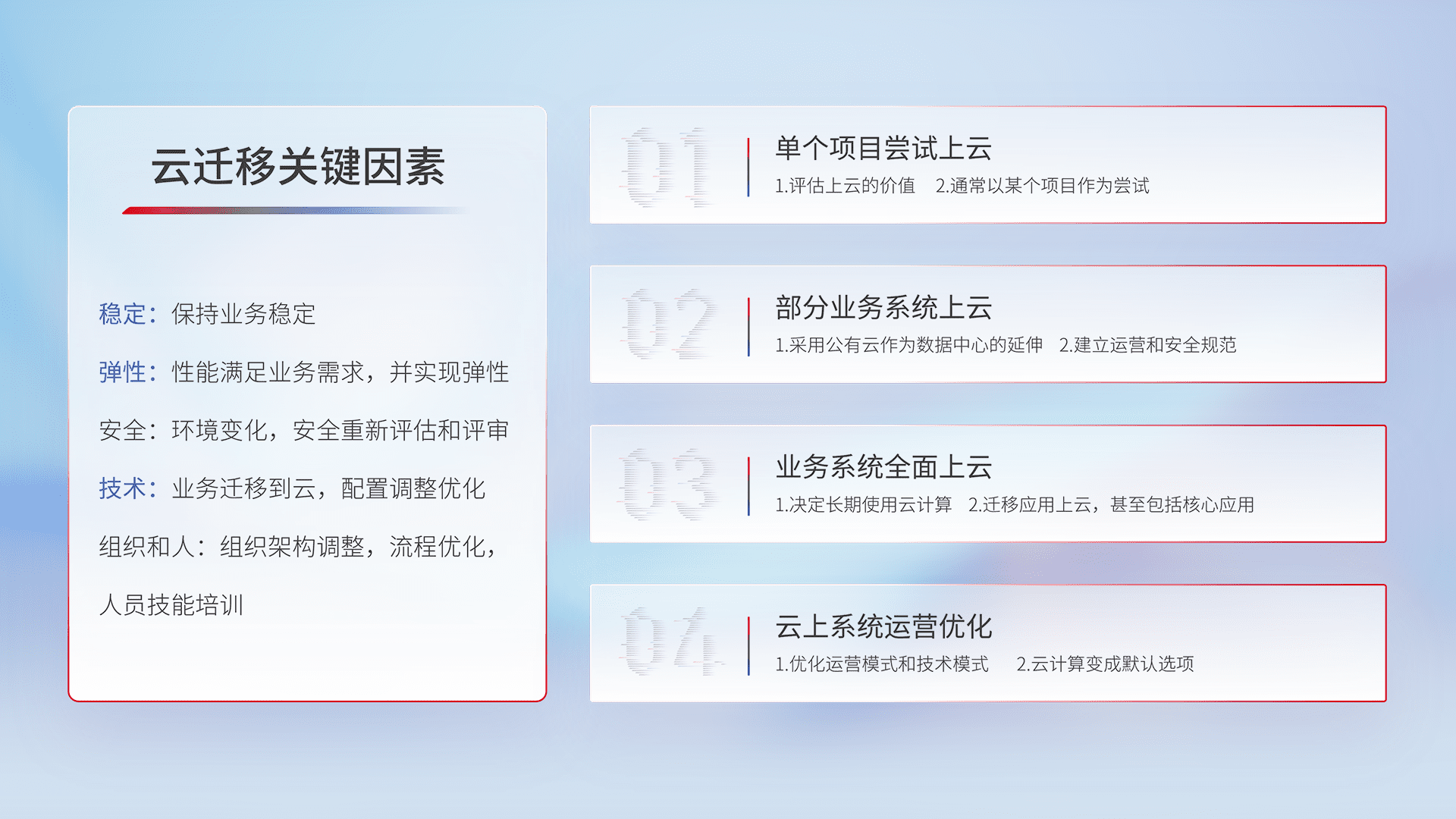 结合实际业务,,从规划设计、、、、云平台选型、、、、云原生改造、、、、数据迁移、、、集成交付,,迁移全过程为客户识别最佳上云路径,,,做好风险识别管理,,设计网络架构、、、、身份权限、、、安全审计合规、、、操作审计、、日志审计、、、监控告警策略、、、多站点容灾设计等,,对云上基础设施进行整体规划,,,提升IT治理水平,,,以满足弹性、、、高可用、、、高性能的需求。。。