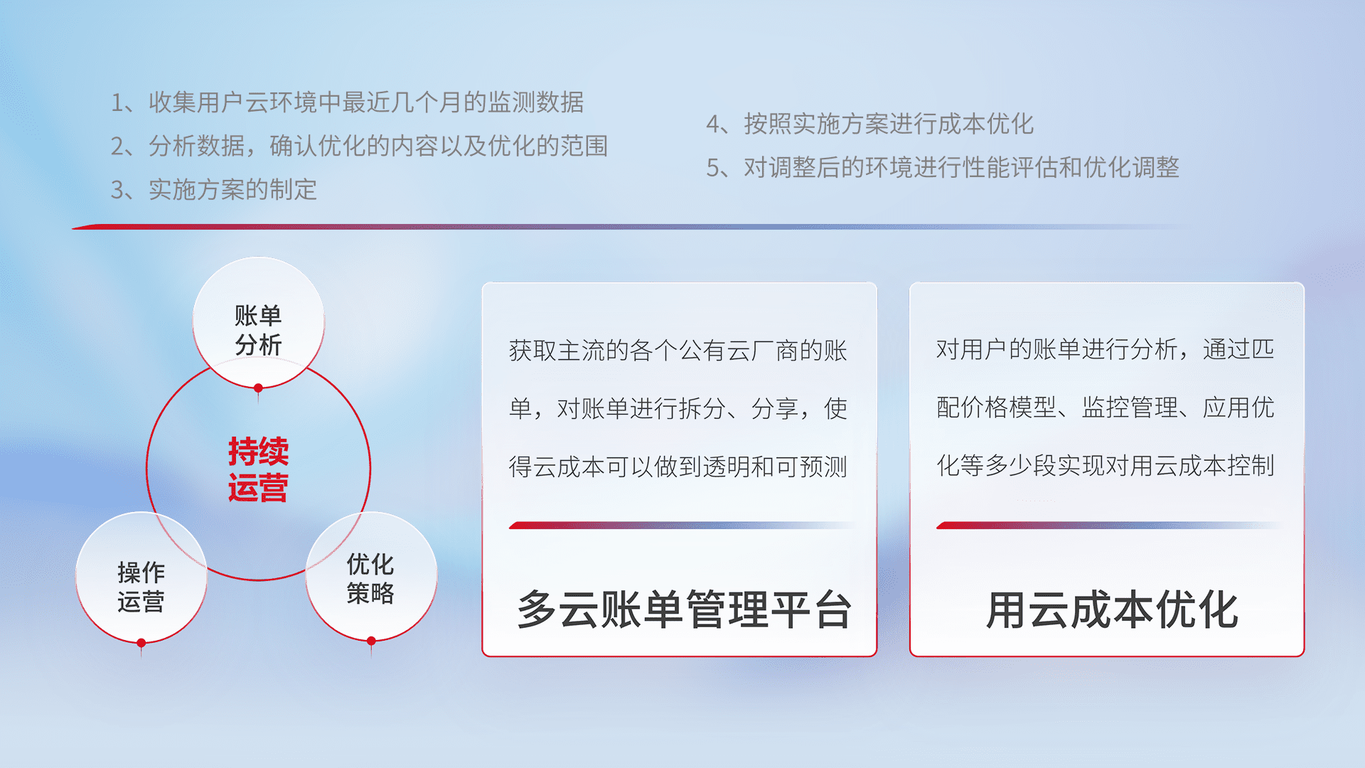 通过多云纳管,,,以统一的资源数据模型把客户的云资源进行抽象和封装,,,进而实现对多云资源的统一操作,,保障云资源管理的可靠性、、、稳定性与可用性。。。。量身定制化运维内容,,配置、、开发运维、、、、补丁管理、、、、备份、、、、监控、、、认证和访问管理、、、审计和日常巡检等,,保障在用云过程中的可靠度,,,,稳定度以及高可用率。。